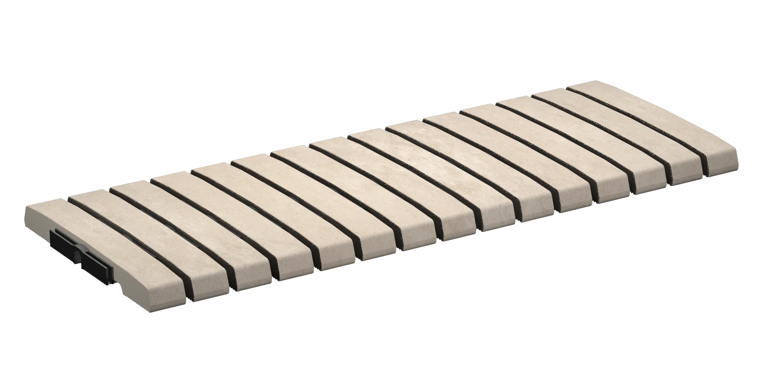 Ova otvorena rešetka izrađena je od visokokvalitetne keramike, koja pruža odličnu otpornost na vlagu, hlor, UV zračenje i mehanička opterećenja. Njen dizajn sa precizno postavljenim prorezima omogućava brzo oticanje vode, dok protivklizna površina doprinosi sigurnosti korisnika. Namenjena je za upotrebu u privatnim, hotelskim i javnim bazenima sa prelivnim sistemima.