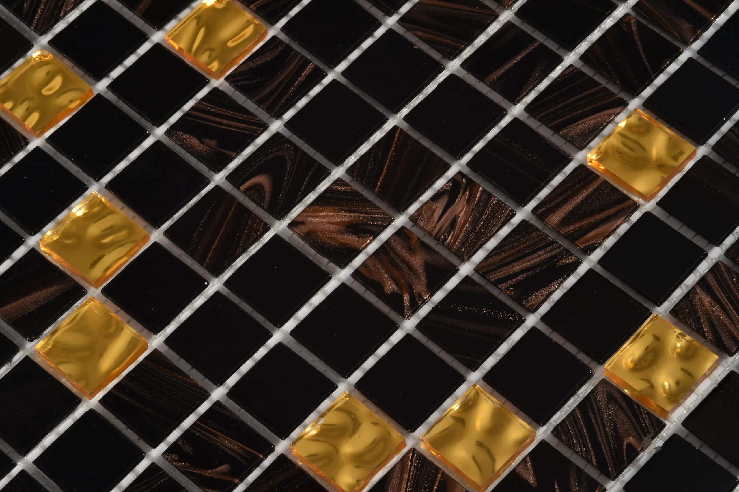Stakleni mozaik Dark Gold kombinuje nijanse A19N, G21 i G22, stvarajući luksuzan, elegantan i vizuelno atraktivan efekat. Idealno rešenje za bazene, kupatila, kuhinje, wellness i dekorativne zidne površine. Mozaik je postavljen na mrežici, što omogućava jednostavnu i preciznu ugradnju.