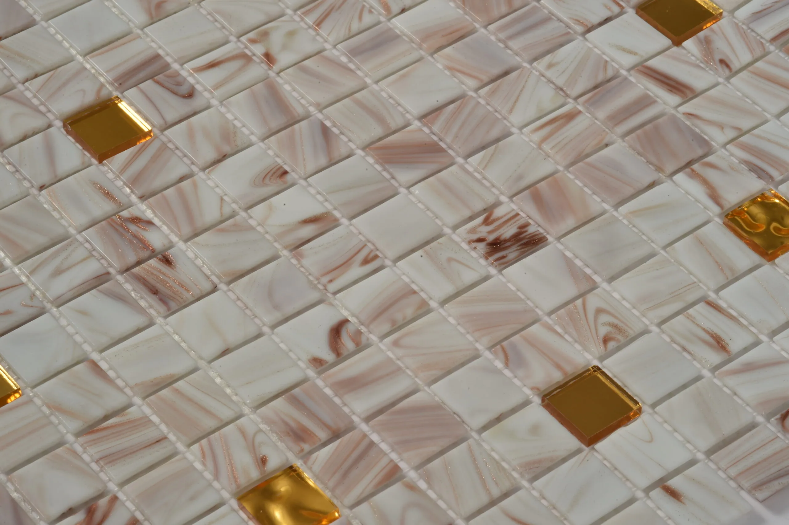 Stakleni mozaik White Gold kombinuje nijanse G11 sa detaljima HA01 i HA02 (po 4 pločice), stvarajući sofisticiran vizuelni efekat sa zlatnim i perlastim tonovima. Idealan je za bazene, kupatila, kuhinje, wellness i dekorativne zidne i podne površine. Mozaik je postavljen na mrežici, što omogućava brzu i preciznu ugradnju.