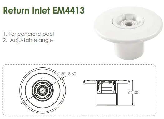 Zidna mlaznica Emaux Fi63 za betonske bazene dizajnirana je za pouzdanu i efikasnu cirkulaciju vode. Montira se na lepak, što omogućava čvrstu i trajnu ugradnju u betonsku konstrukciju.