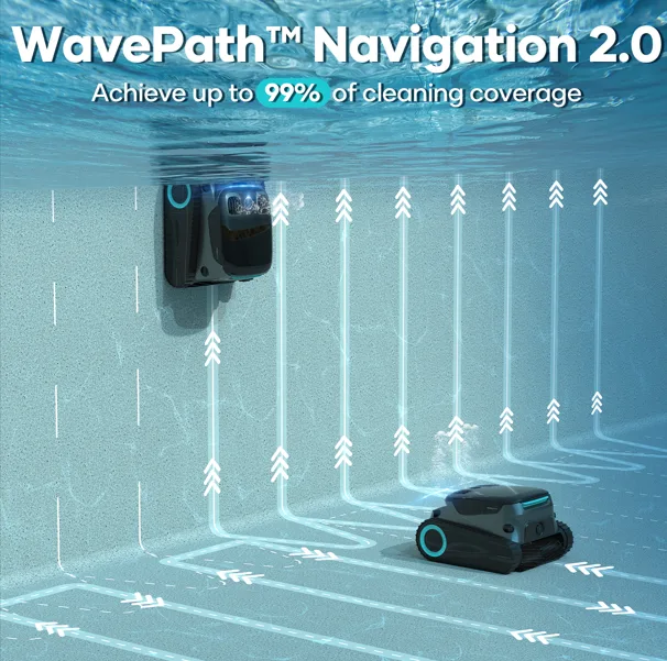 Zahvaljujući unapređenom navigacionom sistemu, robot se efikasno kreće po bazenu, pažljivo prateći pravce bez preskakanja delova. Inteligentno planira putanju i prilagođava način čišćenja svim oblicima bazena.
