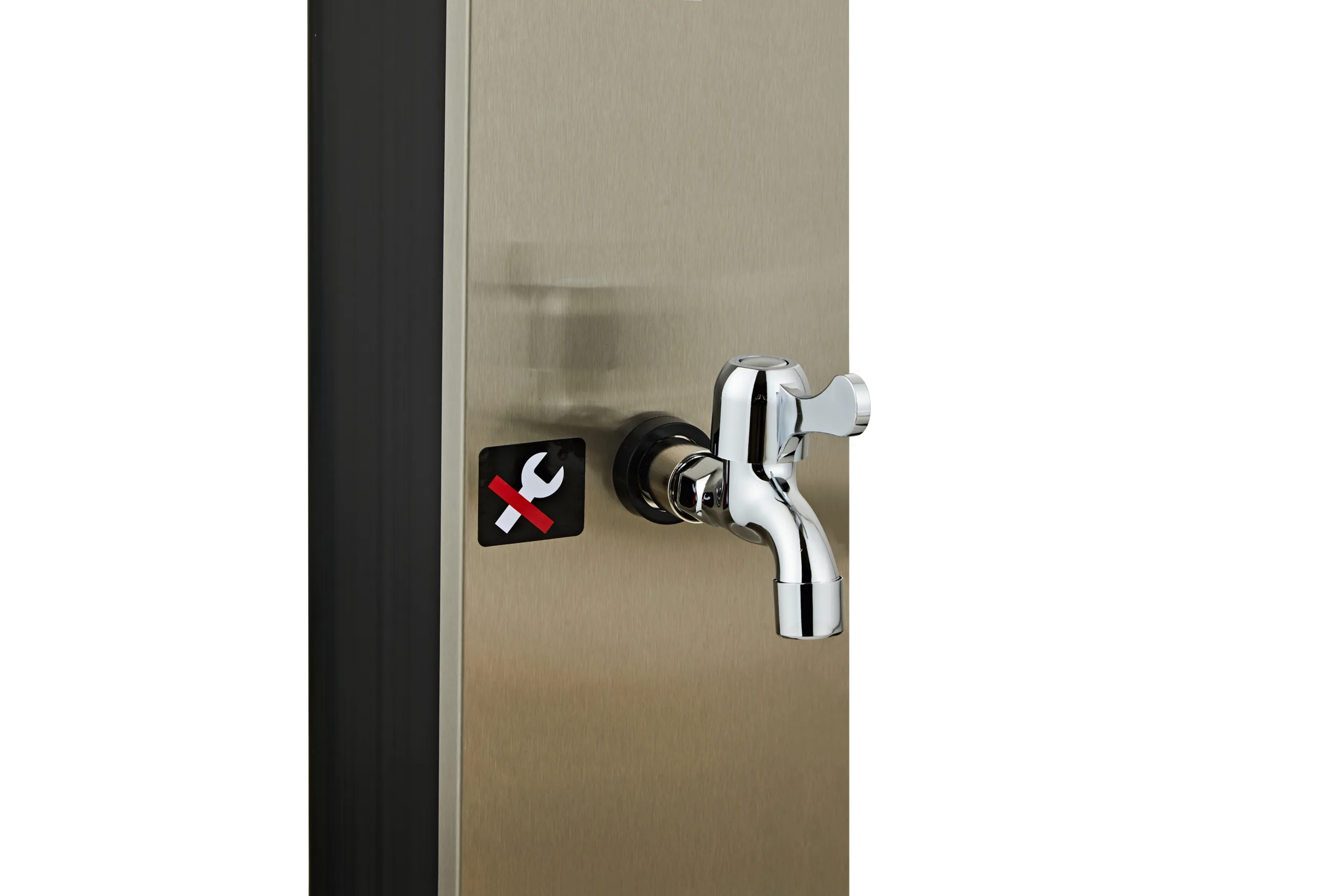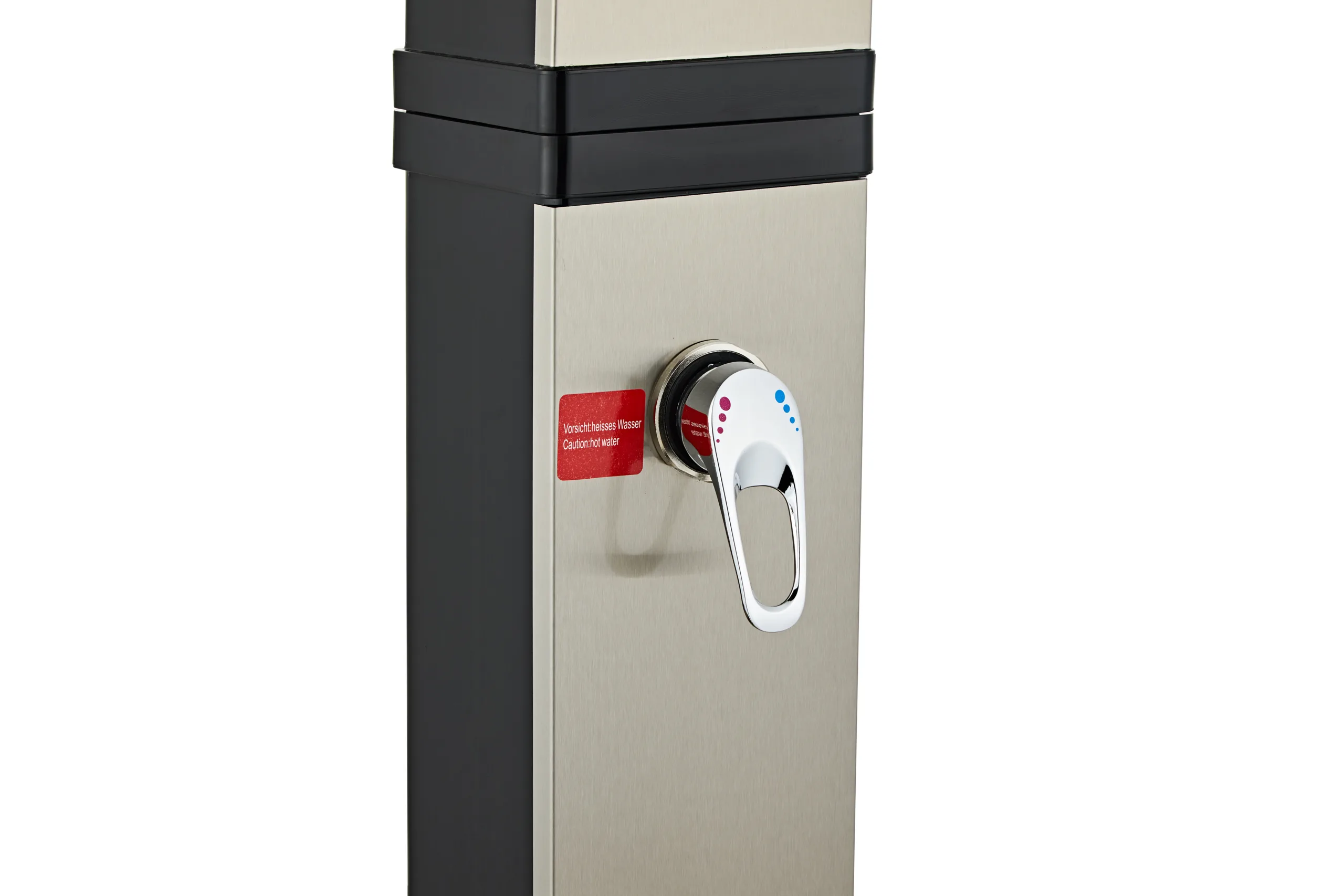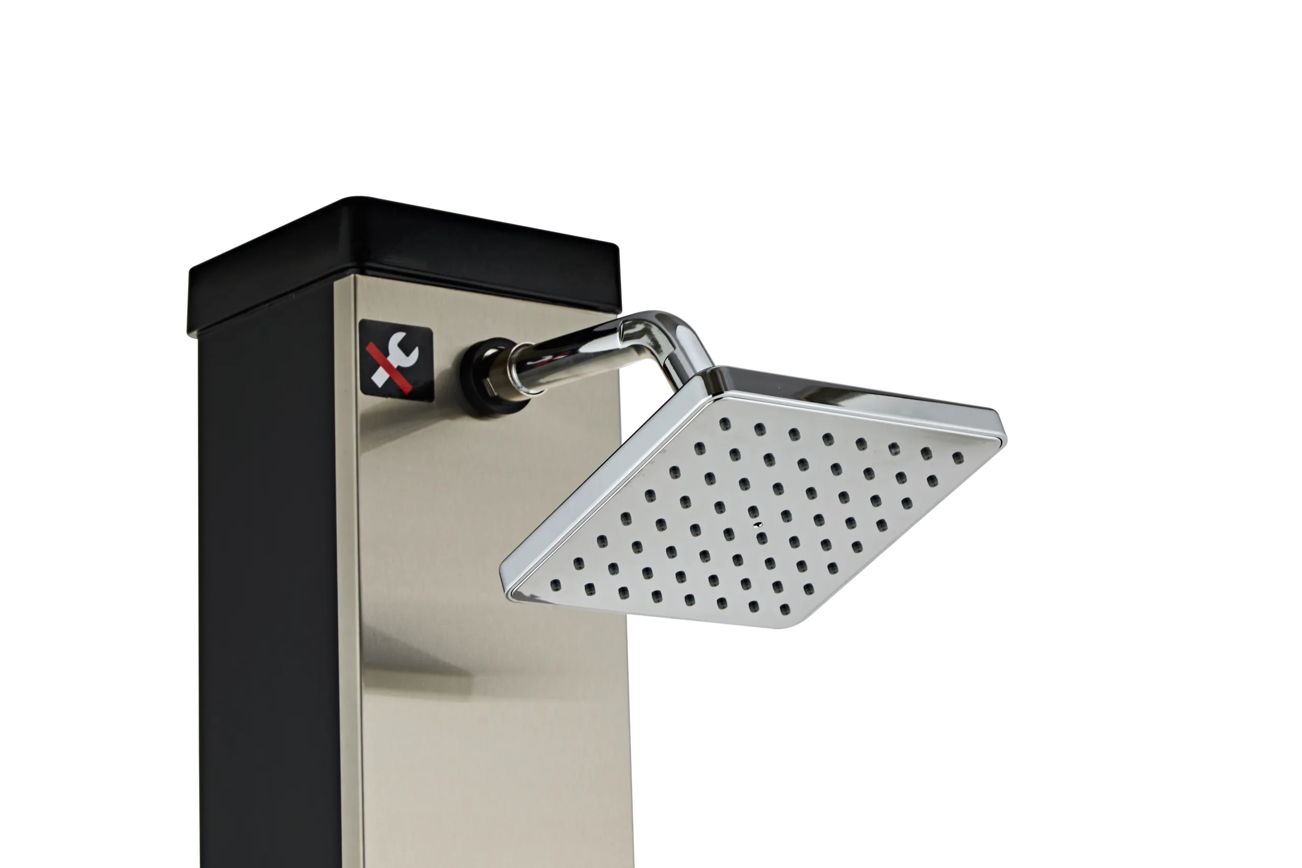 Ovaj spoljni solarni tuš u crnoj boji sa niklovanom maskom kombinuje stil, funkcionalnost i jednostavnu upotrebu. Idealno rešenje za dvorišta, terase i prostore pored bazena, omogućava osveženje i toplu vodu zahvaljujući sunčevoj energiji, bez potrošnje električne energije.