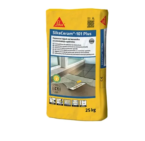 SikaCeram®-101 PLUS je pripremljena praškasta mešavina visokokvalitetnih cementa sa dodatkom polimera, mineralnih punila (silika/kvarc) i specijalnih aditiva. Spreman je za upotrebu uz dodatak vode i namenjen za lepljenje keramičkih pločica na unutrašnjim zidnim i podnim površinama. Pogodan je za nanos sloja do 10 mm.