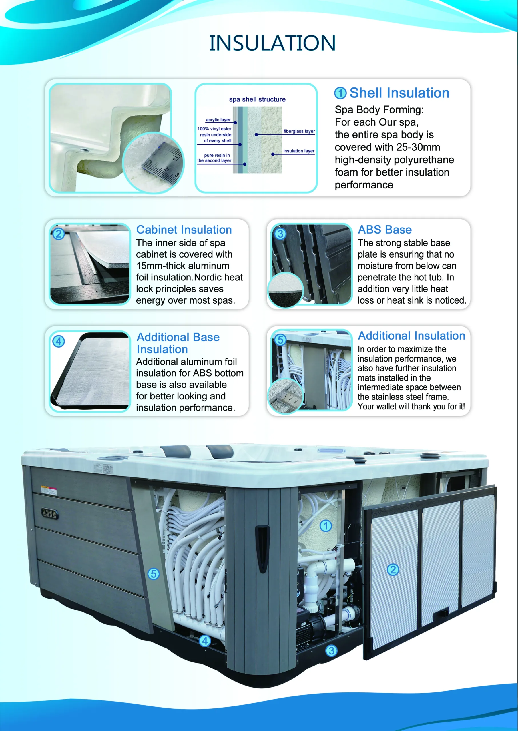 • Kompletan spa sistem – ozon, antibakterijska filtracija, termo pokrivač