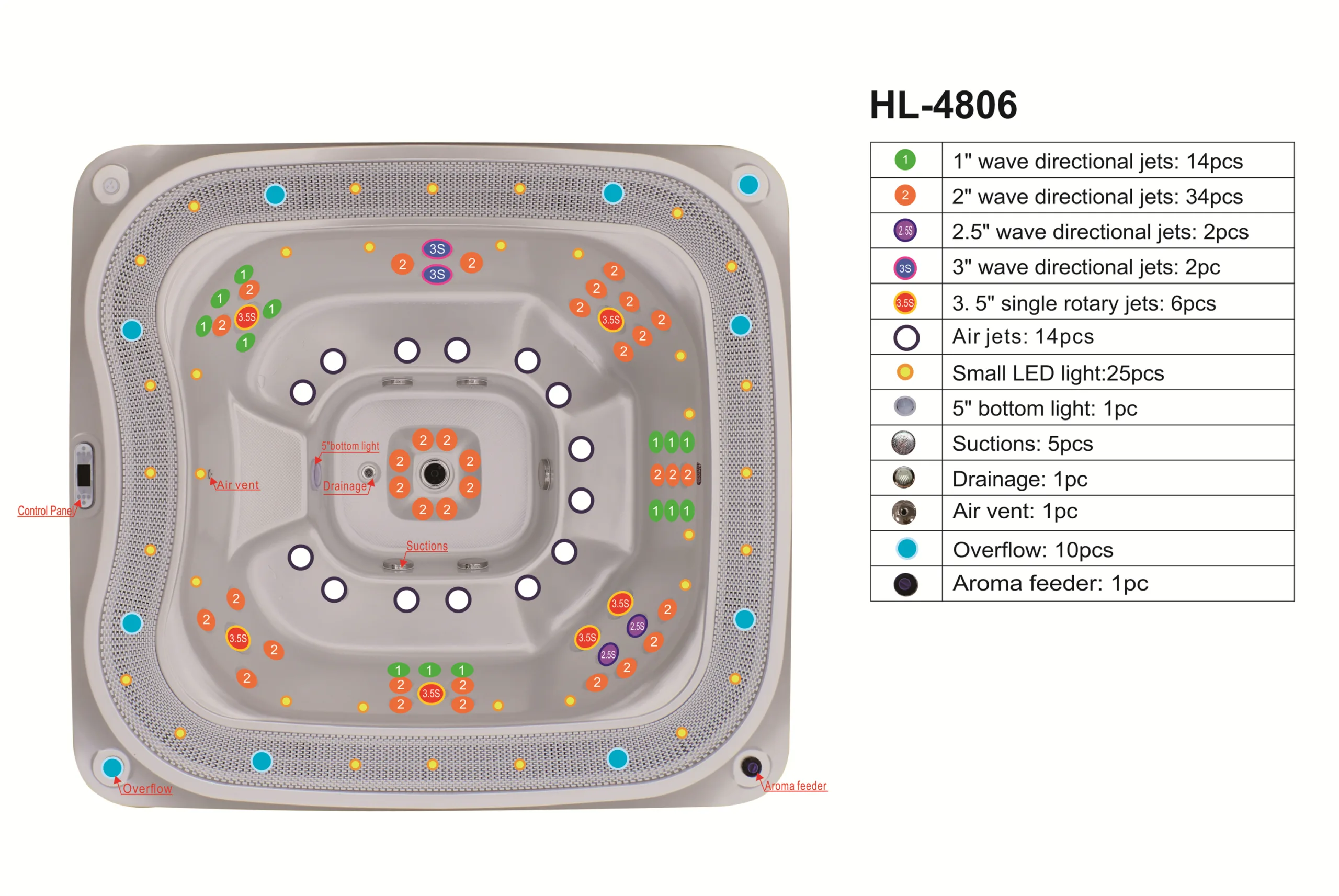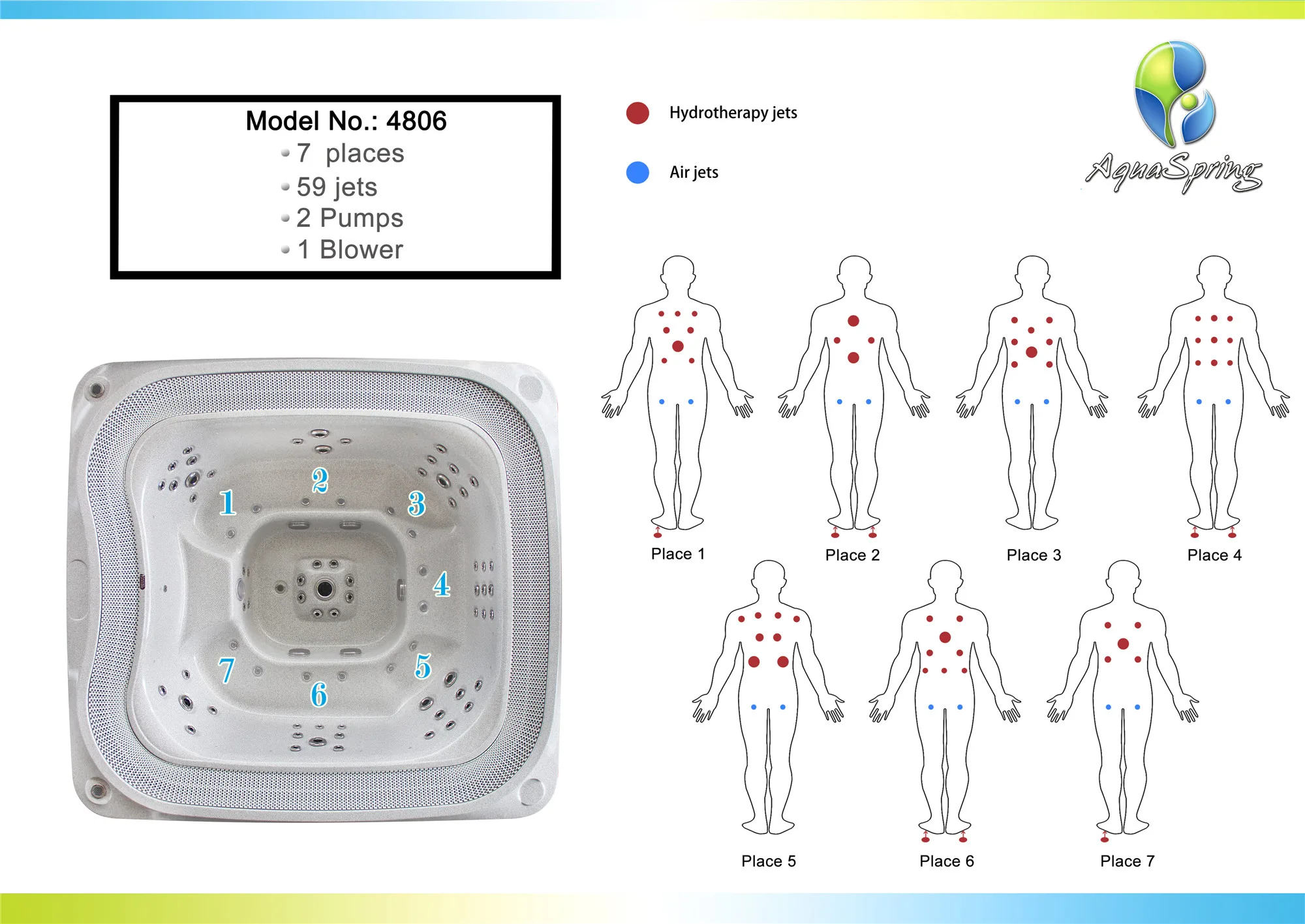 Model INFINITY 4806 kombinuje prostran dizajn, moćnu hidro-masažu i naprednu spa tehnologiju. Napravljen je od kvalitetnog 8mm akrila Lucite Int. (USA), sa masivnom inox konstrukcijom i Fiber-glass ojačanjem, što garantuje dugovečnost i sigurnost. Idealan je za luksuzne kuće, vikendice, hotele i wellness centre.