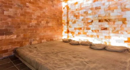 -toplu klupu, po duzoj strani zavrsnu obradu u mozaiku, iza nje do gornje visine klupe 100cm. Do 200cm postavljamo slane cigle iza kojih je led rasveta. Ostatak zidova i plafona je u solju sa tri nanosenja talasastih-nepravilnih zidova.