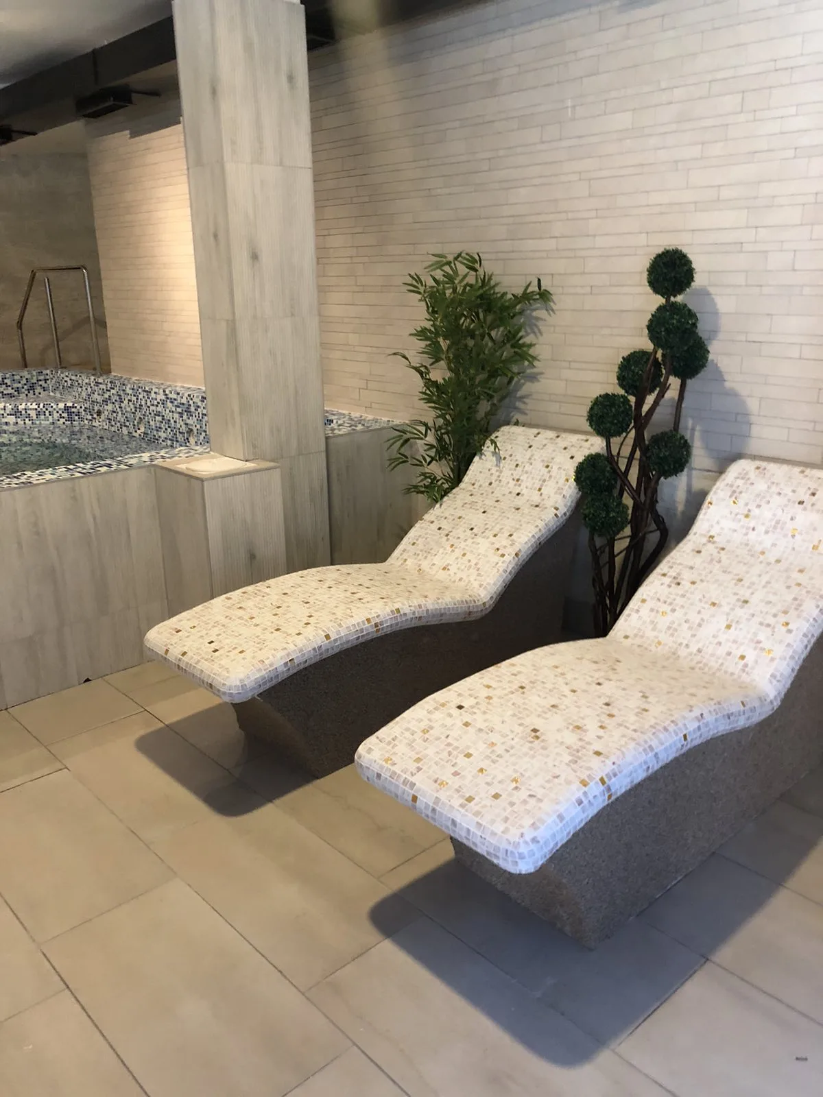 Ovaj anatomski tepidarijum dimenzija 600×1900 mm kombinuje funkcionalnost i estetiku, sa gornjom pločom izrađenom u mozaiku po vašem izboru. U cenu je uključen bilo koji mozaik na mrežici iz naše ponude do 30 €/m², što omogućava jednostavno prilagođavanje stilu vaše wellness sobe.